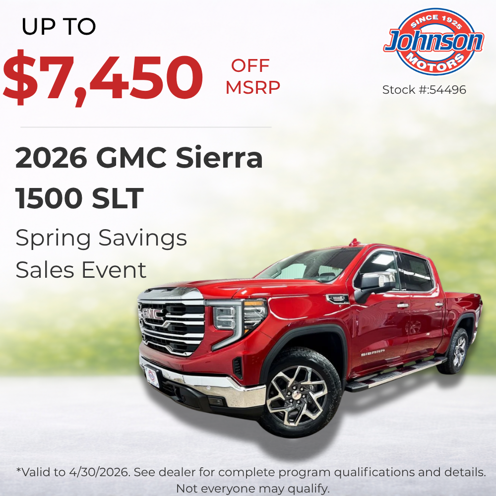Prices include standard rebates. MSRP may not represent actual sale price. Johnson Motors sales price for all, while supplies last. See dealer for details. Service fees may be applied to final sales price. Disclaimer: The Manufacturer’s Suggested Retail Price excludes tax, title, license, dealer fees and optional equipment. Dealer sets final price. Dealer Discount applied to everyoneThe Manufacturer’s Suggested Retail Price excludes tax, title, license, dealer fees and optional equipment. Dealer sets final price. Certain Dealer Incentives or offers may not be available with low interest or other incentive offers, and vehicle price may not include dealer added accessories. All advertised prices exclude tax, title and license fees, finance charges, dealer document processing fee, and electronic filing charge. In-Transit arrival dates are estimates and may change due to factors beyond our control. Please contact the dealership for complete and accurate availability and pricing. Pricing and website errors may occur on vehicles and offers, and inaccurate prices, photos, features, accessories or other errors do not constitute a valid retail offer. MPG based on EPA estimates only and may vary based on driving habits, vehicle condition, and battery age affect results. *Dealer Discount applies to everyone. The Manufacturer’s Suggested Retail Price excludes tax, title, license, dealer fees and optional equipment. Dealer sets final price. If a vehicle is designated or has at any time been designated as a Courtesy Transportation Unit that vehicle has more mileage than a normal new retail unit.