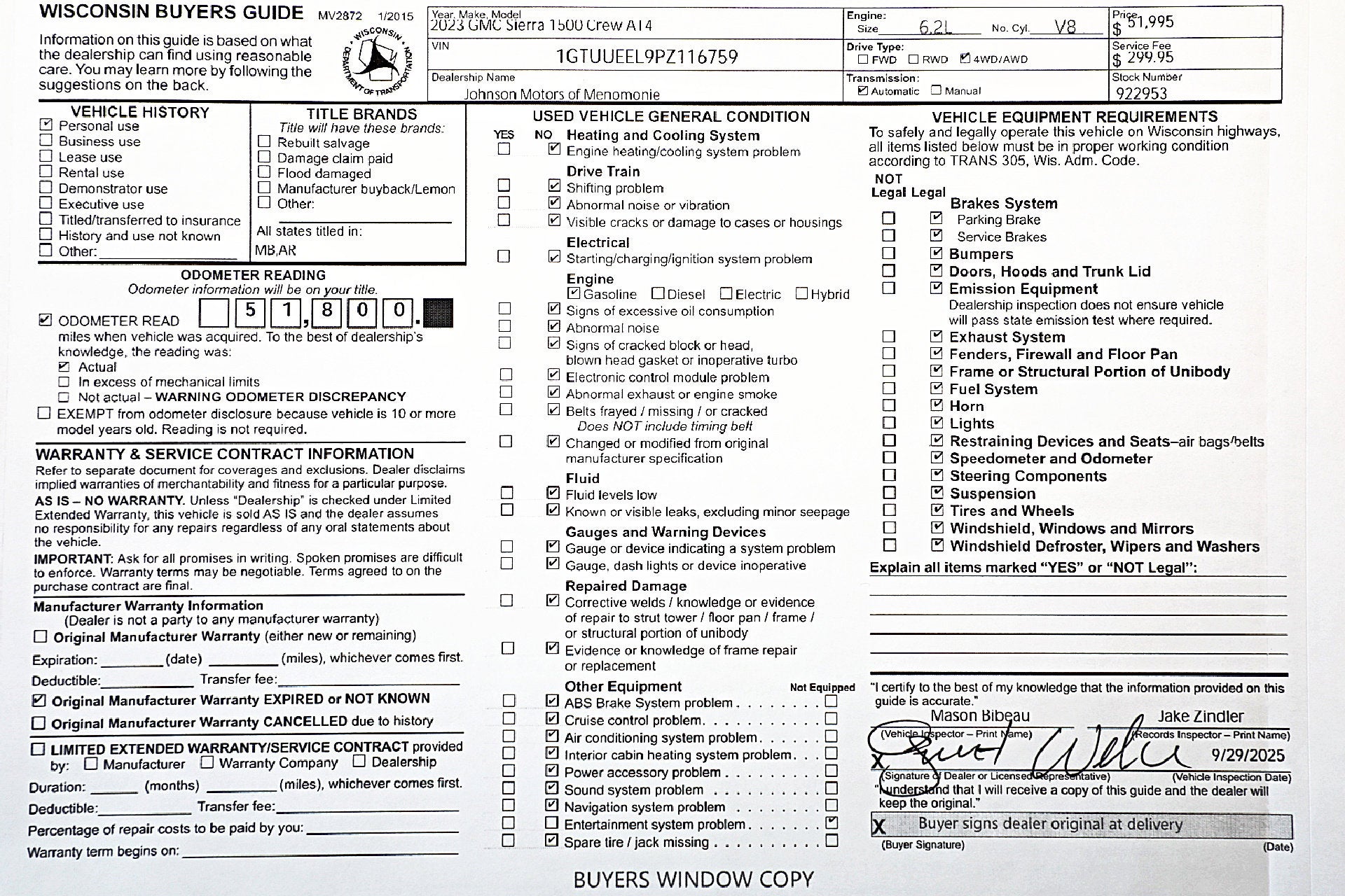 Price does not include sales tax, title, registration, or $299.95 service fee.