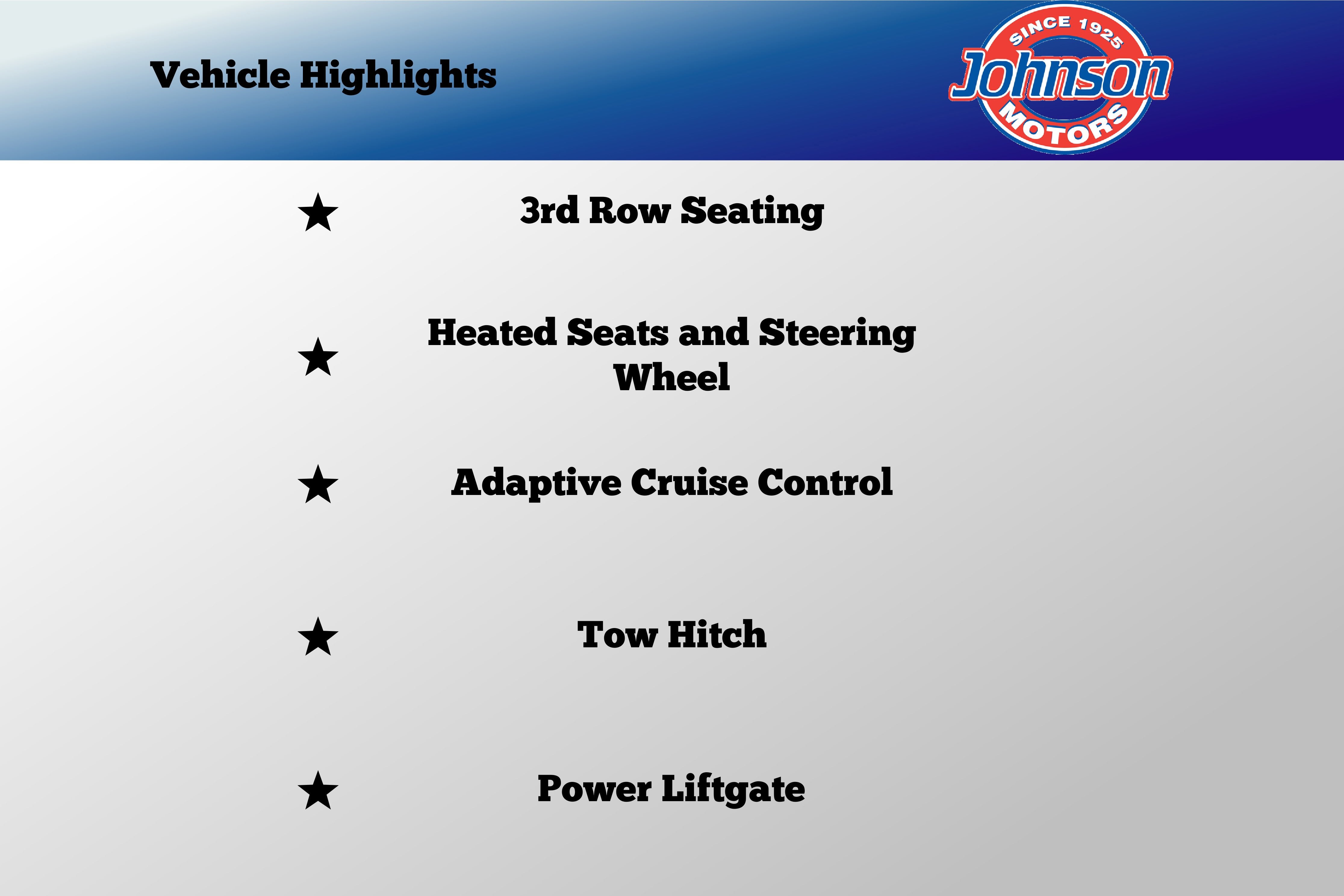 - Power Rear Windows and Fixed 3rd Row Windows